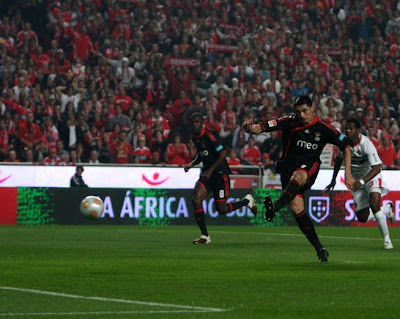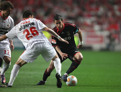 Nenhuma surpresa no onze inicial do Benfica, com o Weldon, justificadamente, a manter a titularidade no ataque, e também com o Rúben Amorim a manter-se no onze, desta vez recuando para a direita da defesa, já que em Coimbra tinha jogado no meio campo. O Cardozo acabou por jogar também, apesar de ser notório que não estaria nas melhores condições físicas e que terá estado em dúvida até ao último momento, o que se comprova pela presença do Kardec no aquecimento. Conforme escrevi, as coisas começaram a resolver-se muito cedo: no primeiro ataque do Benfica, aos dois minutos de jogo, penálti por mão na bola após cruzamento do Weldon na esquerda, e golo do Cardozo. E aos nove minutos, a coisa ficou ainda mais fácil, já que o mesmo jogador que tinha cometido o penálti teve uma entrada desmioladamente desnecessária sobre o Di María, e foi naturalmente expulso. As facilidades do Benfica neste jogo nem terão sido tanto uma consequência directa da expulsão, mas mais, na minha opinião, da atitude do Olhanense, que mesmo reduzido a dez não abdicou de continuar a jogar no seu estilo habitual, mantendo quase sempre três jogadores bem abertos na frente e deixando apenas dois médios. Isto resultou em muito espaço livre para que os nossos jogadores pudessem explorar em ataques rápidos, e por onde o Aimar podia deambular e movimentar todo o nosso futebol.