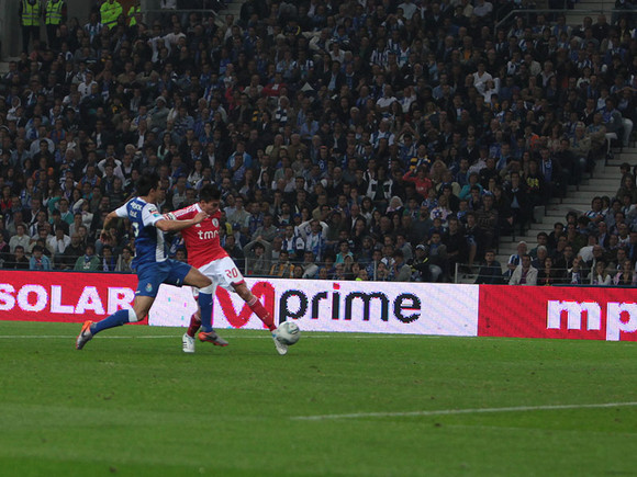 Onze esperado do Benfica, sem quaisquer 'surpresas' de última hora. Os primeiros dez minutos de jogo pareceram ser de estudo mútuo, mas depois o Porto pareceu acordar com uma jogada individual do Hulk, que com um remate de meia distância obrigou o Artur a uma grande defesa. A partir daí, e durante o resto da primeira parte, o Porto esteve quase sempre por cima no jogo, controlando a posse de bola e sendo muito mais rematador. No entanto este domínio do Porto nunca chegou a deixar-me muito nervoso, porque fiquei sempre com a sensação de que a nossa equipa mantinha uma serenidade que, sinceramente, não nos é muito habitual naquele estádio. Apesar de mais pressionada, manteve-se sempre bastante organizada e concentrada, dando poucas oportunidades claras de golo ao adversário, que apesar de muito mais rematador, via a maior parte desses remates surgirem de longa distância, e quase sempre pelo Hulk (quer de bola corrida, quer em livres). Uma enorme excepção no entanto à passagem da meia hora, quando o Fucile teve uma oportunidade flagrante para marcar, surgindo à vontade na área para proporcionar a segunda grande defesa da noite ao Artur. A grande lacuna no jogo do Benfica foi no entanto no ataque, já que praticamente não conseguimos construir jogadas ofensivas ou sequer sair para o ataque da forma rápida como fazemos habitualmente - não houve no entanto apenas demérito do Benfica nisto, pois foi também o resultado da pressão que o Porto exerceu. Se o Benfica ia mantendo a concentração defensiva no jogo corrido, tal já não aconteceu numa bola parada: um livre sobre a zona lateral direita da nossa área permitiu ao Porto colocar-se em vantagem, graças a um bom cabeceamento cruzado do Kléber, que se antecipou com alguma facilidade ao Maxi. O golo surgiu quando faltavam pouco menos de dez minutos para jogar na primeira parte, e só depois é que o Benfica conseguiu dar alguns sinais de querer sacudir a pressão, mas o Porto continuou na mó de cima até ao apito para intervalo.