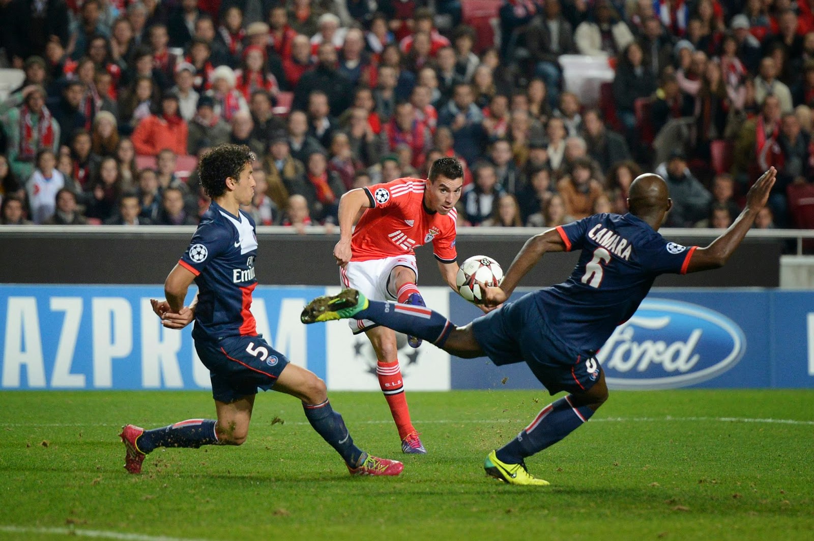 Regresso ao 4-3-3, sendo o Rodrigo o avançado preterido. O trio do meio campo foi formado pelo Fejsa, Matic e Enzo, com este último a jogar numa posição mais avançada, muitas vezes em apoio directo ao ponta-de-lança. Na defesa, realce para o regresso do Sílvio à esquerda. Boa entrada do Benfica no jogo, com o Enzo a dar logo o primeiro sinal de perigo num bom remate de fora da área, que obrigou o guarda-redes a uma defesa mais apertada. O PSG tentou fazer o mesmo que tinha feito no jogo em França, procurando manter a posse de bola trocando-a entre os seus jogadores no seu meio campo defensivo, sem grande progressão e tentando manter o ritmo de jogo baixo, mas acabou por ter que abandonar essas intenções devido à pressão que o Benfica procurou fazer logo em zonas mais adiantadas do campo. Só o Benfica parecia ter iniciativa no jogo, e foi por isso natural que as oportunidades acontecessem quase exclusivamente para o nosso lado. Infelizmente a falta de eficácia voltou a ser um problema o que explica que o resultado se fosse mantendo em branco. Houve duas ocasiões em particular que deveriam ter sido mais bem aproveitadas, pelo Gaitán, num remate cruzado, e pelo Matic, num cabeceamento em que ele apareceu completamente livre de marcação no interior da área. Em ambas as ocasiões a bola passou muito perto do alvo. Já é um chavão que quem não marca arrisca-se a sofrer, e mais uma vez isso se verificou. O PSG apenas por uma vez, num remate cruzado do Ménez, tinha dado um verdadeiro sinal de perigo no ataque. Da segunda vez que o fez, conquistou um canto, e na sequência do mesmo mais uma vez a nossa equipa revelou dificuldades em afastar a bola (não percebi bem como, mas pareceu-me que à saída da área o Gaitán e o Markovic desentenderam-se e nenhum deles acabou por atacar a bola) e na insistência da jogada o Cavani marcou à boca da baliza. Faltavam oito minutos para o intervalo, mas este tempo foi suficiente para que o Benfica corrigisse a injustiça no marcador, já quase a terminar a primeira parte, num penálti do Lima a castigar uma falta sobre o Sílvio.