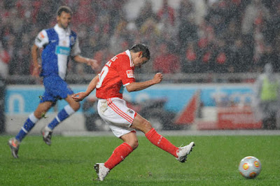A vantagem ao intervalo era mais que justa, e a segunda parte trouxe um Benfica um pouco mais retraído, sem no entanto perder o controlo. Os andrades, naturalmente, tinham que forçar para chegar ao golo, e deixaram o Guarín no balneário, entrando o Varela para o seu lugar, e passando o Homem dos 100 Milhões para o lado do Falcao. Durante os primeiros quinze minutos não se passou nada de extraordinário, mas depois começou a ser visível que jogadores com menor ritmo competitivo, como o Carlos Martins e o Urreta, estavam a perder gás, e isto permitiu aos andrades subirem um pouco mais, e ter os seus dois melhores momentos no jogo: um remate do Pereira que o Quim defendeu, e um outro do Meireles que tabelou num jogador nosso e acabou por passar pouco ao lado. O Jorge Jesus viu bem e mexeu bem na equipa. As entradas do Weldon (foi encostar-se à esquerda) e do Luís Filipe (para médio direito, passando o Ramires para o centro - depois o Luís Filipe acabou por trocar com com o Maxi), quando faltavam cerca de vinte e cinco minutos para o final, acabaram com quaisquer veleidades do nosso adversário. Infelizmente o Ramires lesionou-se pouco depois, e teve que ser substituído pelo Menezes. O certo é que depois das substituições o Benfica voltou a ter o jogo na mão, e raramente o nosso adversário deu ideia de poder discutir o resultado, já que nesta fase já optava quase exclusivamente pelo pontapé para a frente. Segurámos a justíssima vitória, que até poderia ter sido mais dilatada, sobretudo se um penálti absolutamente incrível cometido pela Meretriz Uruguaia tem sido assinalado. Há lances que são duvidosos, e que muitas vezes até depois das repetições em câmara lenta se continua com dúvidas. Mas aquilo? Alguém pode ter ficado com dúvidas? Acho que só em Portugal, e só aquele clube é que se safaria de ter aquele penálti assinalado contra. Ah, e para os amantes de estatísticas que pululam na comunicação social, sugiro que vão verificar quantos jogos da Liga o fóculporto conseguiu vencer depois do adversário marcar primeiro.