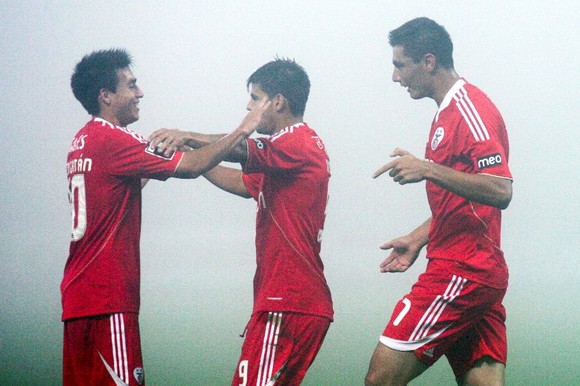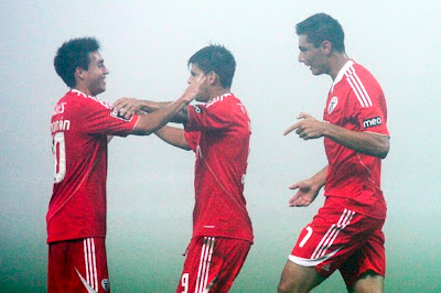 Apenas uma alteração forçada no onze que nos apurou para a fase de grupos da Champions, com a entrada do Jardel para o lugar do lesionado Garay. Da primeira parte não há muito para dizer, porque na verdade o nevoeiro pouco deixou ver. O Nacional teve uma entrada forte no jogo, e podia ter marcado cedo, não fosse o Artur defender com o pé o remate do isolado Mateus. Aos onze minutos o jogo foi interrompido por falta de visibilidade, e essa interrupção pareceu fazer bem à nossa equipa, que regressou mais concentrada, chegando ao golo à passagem dos vinte minutos, com o Cardozo, bem no centro da área, a corresponder com um cabeceamento exemplar, de cima para baixo, a um centro do Gaitán na direita. Do pouco que se conseguiu ver no resto da primeira parte (o jogo voltou a ser interrompido após a meia hora) realce apenas para um grande remate do Cardozo, a proporcionar uma boa defesa ao guarda-redes do Nacional.