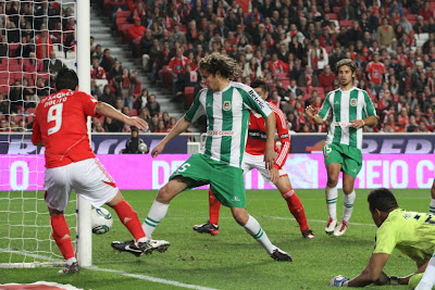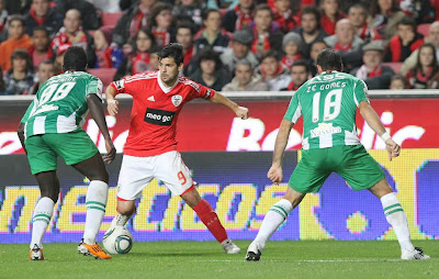 Alguma surpresa ao ver o Rodrigo e o Cardozo no onze inicial, mas depois vimos que eles não formavam uma dupla de avançados tradicional, pois o Rodrigo jogava mais encostado à direita - embora depois tenha passado a vaguear mais pelo ataque. O jogo na primeira parte foi muito semelhante ao que tínhamos visto para a Taça. O Benfica com mais posse de bola, muita disputa a meio campo, e o Marítimo a tentar sair em contra-ataques rápidos com bolas para o Sami e o Baba sempre que recuperava a bola. Mas após o primeiro quarto de hora (durante o qual o Marítimo criou a sua única verdadeira oportunidade de golo durante todo o jogo) o Benfica foi progressivamente encostando o Marítimo mais atrás, e conseguindo construir oportunidades para chegar à vantagem. Duas delas flagrantes: primeiro foi o Aimar, que ficou isolado após um passe de calcanhar do Bruno César, mas em vez de rematar preferiu tentar a finta para a linha de fundo e o Peçanha tirou-lhe a bola; depois a mais escandalosa de todo o jogo, com o Cardozo a rematar ao lado após um centro rasteiro do Maxi que o deixou solto de marcação, de baliza escancarada e a pouco mais de dois metros da linha. Falhas graves, que normalmente em jogos desta dificuldade podem significar resultados desastrosos, e que explicam que se tenha saído para intervalo com o nulo no marcador.
