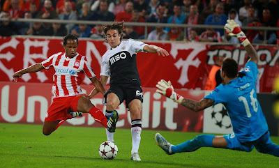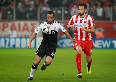 A maior novidade para mim foi que, num jogo teoricamente de dificuldade mais elevada, o nosso treinador optou por não entregar logo a abrir a superioridade numérica no centro do terreno. Três médios de início, com a titularidade do Rúben Amorim junto dos habituais Matic e Enzo. Na esquerda da defesa surgiu o Sílvio, e no ataque foi o Markovic a ocupar o lugar que nos últimos jogos tinha sido do Ivan Cavaleiro. Não houve inferno nenhum em Atenas - o Benfica entrou a todo o gás, a jogar de forma completamente descontraída e a empurrar o adversário para junto da sua área. Os primeiros dez minutos foram o modelo perfeito daquilo que viria a ser o jogo inteiro: ataque constante do Benfica, com o Olympiacos praticamente a não passar do meio campo, e duas enormes oportunidades de golo, ambas negadas de forma sublime pelo Roberto. Primeiro num remate rasteiro de primeira do Cardozo, e depois na cara do isolado Markovic. Não marcar duas oportunidades claras como estas num jogo da Champions já seria uma situação suficientemente lamentável, mas aquilo foi apenas uma amostra do que estava para vir. Pior ainda, praticamente da primeira vez que o Olympiacos subiu à nossa área (acabaram por fazer dois remates à nossa baliza durante todo o jogo), marcou. Nós defendemos os cantos à zona, mas quando a bola é enviada para uma 'zona de ninguém' há sempre o risco de acontecer o que aconteceu, que foi um dos centrais adversários aparecer livre de marcação, vindo do limite da área, para cabecear para o golo. Já disse antes que tenho alguma embirração com o Artur, por isso eu próprio darei o devido desconto à opinião com que fiquei do lance, mas a verdade é que acho que o Artur poderia ter feito melhor do que defender a bola para dentro da baliza. Ao contrário do que já vimos esta época, a nossa equipa não reagiu mal ao golo sofrido, e continuou a jogar exactamente da mesma forma, dominando o jogo e o adversário e tentando chegar ao golo de todas as formas. Foi já perto do intervalo que voltámos a ter uma grande oportunidade, e desta vez (talvez a única durante todo o jogo) não foi o Roberto o responsável por não a concretizarmos. Foi mesmo desconcentração ou displicência do Matic, que se apanhou sozinho em frente à baliza após um canto, e provavelmente pensou que estaria em fora-de-jogo, tendo por isso tentado um toque displicente com o calcanhar.