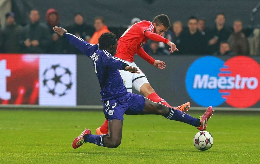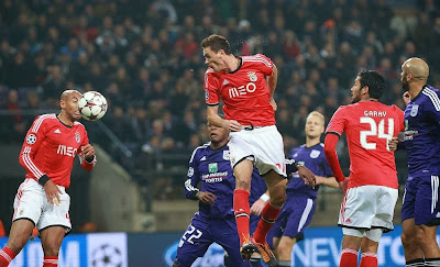 Novas mexidas no onze, a principal delas no meio campo, para onde entrou o Fejsa. Na defesa as laterais foram entregues ao Maxi e ao André Almeida. Em teoria o Benfica deveria jogar em 4-3-3, mas na prático o que vimos acontecer por diversas vezes foi o Markovic a vir para o meio, enquanto que o Enzo ocupava a direita, deixando a equipa mais próxima de um 4-4-2 tradicional. A entrada do Benfica no jogo foi positiva, já que assumimos maior iniciativa e controlámos a posse de bola, enquanto que o Anderlecht se fechava perto da sua área para depois tentar explorar algum contra-ataque. Não criámos muitas ocasiões de golo, mas era o Benfica quem parecia estar claramente por cima. Só que, como tem vindo a acontecer frequentemente, praticamente da primeira vez que o Anderlecht deu sinal de si no ataque, chegou ao golo. Primeiro o Artur defendeu para canto um remate perigoso, e na insistência do canto um dos centrais adversários aproveitou da melhor maneira uma bola embrulhada entre ele e o Luisão para fazer o golo. O golo belga aconteceu aos dezoito minutos, e o Benfica acusou o golpe, pois durante os minutos que se seguiram passámos por algumas dificuldades, com o Anderlecht, empolgado pelo público, a ganhar algum ascendente no jogo. Mas quinze minutos depois chegámos ao empate, num cabeceamento do Matic após livre do Enzo, e a equipa voltou a serenar.