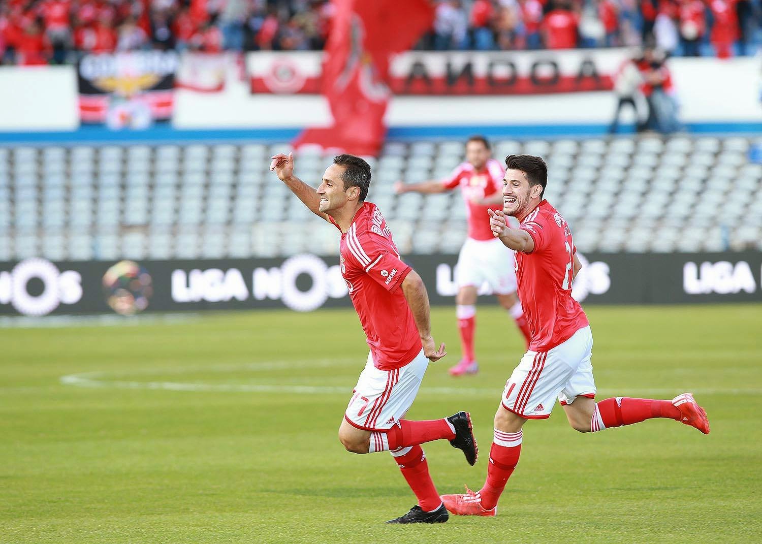 Onze sem qualquer surpresa, onde o Lisandro ocupou o lugar do nosso capitão, a cumprir um jogo de suspensão. Nota de maior destaque para o regresso do fantástico Gaitán à equipa, que tanta falta nos fez contra o Rio Ave. Com ele a música é mesmo outra, e passa a ser uma sinfonia. Sobre o jogo, o que dizer? Foi praticamente um passeio triunfal do Benfica na primeira parte, perante um Nacional sem capacidade nem argumentos para montar qualquer tipo de oposição digna desse nome - zero remates feitos, e poucas mais devem ter sido as vezes em que sequer se aproximaram da nossa baliza. Os madeirenses até vinham com intenção de complicar, tentando exercer uma pressão a campo inteiro em que até colocavam três jogadores a tentar pressionar a nossa saída de bola. Mas como é que se consegue marcar e anular toda a gente quando temos Gaitán, Jonas ou Salvio como autênticos diabos vermelhos à solta sobre o relvado? Sempre em movimento, com constantes trocas de posição, e depois quase imparáveis com a bola nos pés, seja em iniciativas individuais ou em trocas de bola ao primeiro toque com os colegas, é quase impossível travá-los. Quanto a nós, que temos o privilégio de ter tais artistas na equipa, é relaxar, apreciar o espectáculo, e começar a ver as oportunidades a surgir umas a seguir às outras. O Gaitán deu o primeiro aviso, a seguir foi o Jonas, de cabeça, e o sufoco continuou até dar resultados com vinte minutos decorridos. Foi mais uma vez o Jonas, que aproveitou uma iniciativa do Salvio em que este ganhou a linha de fundo e fez o passe atrasado para o remate vitorioso. O recital continuou e foi com toda a naturalidade que chegou um segundo golo dez minutos depois. Desta vez foi o argentino da esquerda a fabricar o golo: o Gaitán entrou por ali, deixou o defesa para trás, e passou a bola para a cabeça do Lima facturar já na pequena área (a bola foi colocada com tanta precisão que aquilo para mim foi um passe e não um centro). Dois golos já davam uma certa tranquilidade, mas isso não significou um abrandar da parte do Benfica, que pouco depois ficou à beira do terceiro golo em mais uma fantástica jogada colectiva que deixou o Jonas na cara do guarda-redes, mas o toque para tentar desviar a bola acabou por deixá-la nas mãos dele. Tivesse o Jonas estado um bocadinho mais inspirado na finalização e não teria saído de campo apenas com dois golos marcados, porque mesmo antes do intervalo mais uma linda jogada de equipa deixou-o com tudo para marcar, mas o cabeceamento que fez levou a bola direitinha às mãos do guarda-redes. Face a tanto e tão bonito futebol mostrado na primeira parte, os dois golos de vantagem à saída para o intervalo até sabiam a pouco. Claramente, a elaborada táctica psicológica do Nacional ao escolher o campo ao contrário (isto anda a tornar-se um hábito entre as equipas que nos visitam) não estava a resultar.